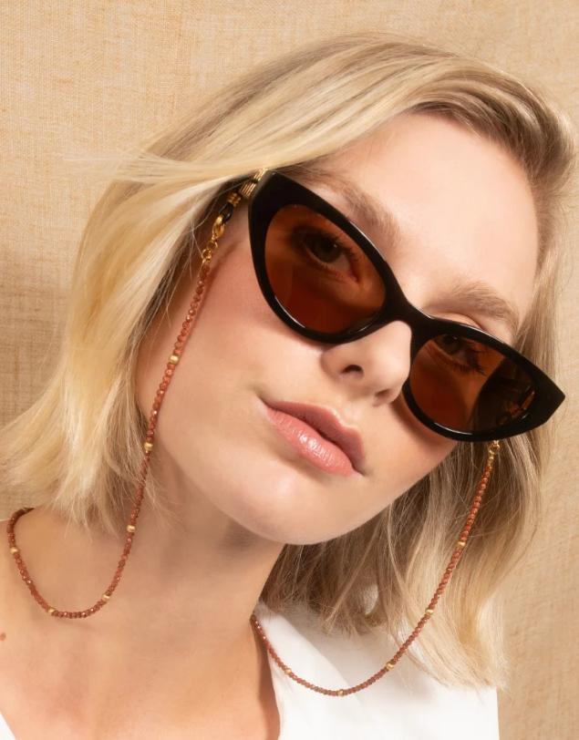 Ga voor tijdloze glamour met het Cleo brillenkoord van Sunny Cords. De combinatie van glazen kralen en 18K vergulde accenten in warme bruintinten geeft elke outfit een verfijnde uitstraling. Licht, luxueus en moeiteloos te dragen – een stijlvolle aanvulling op zowel je bril als zonnebril.
